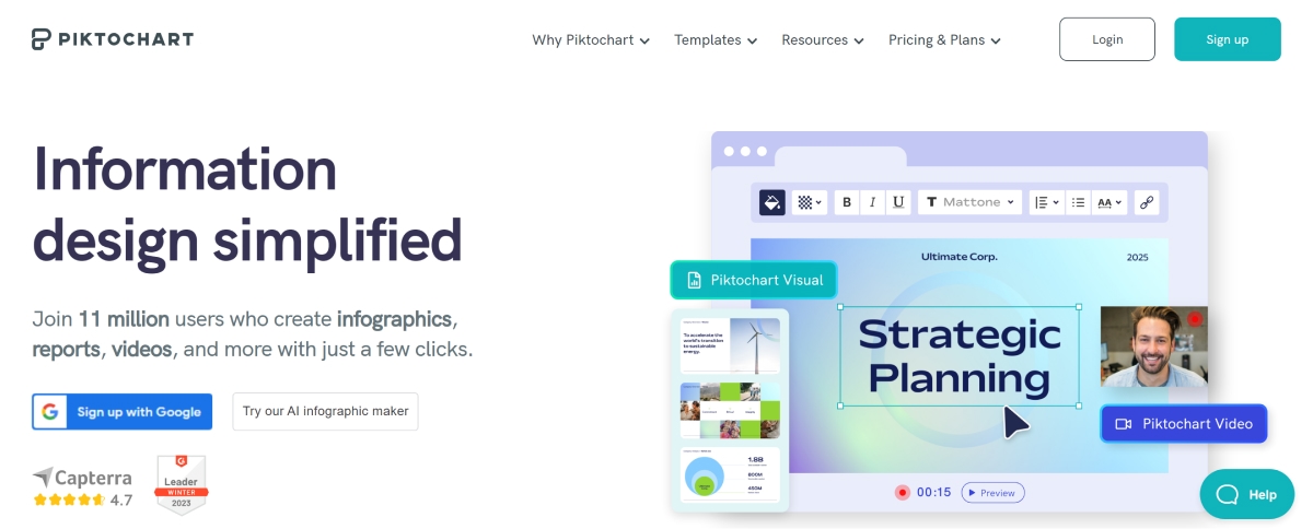 Piktochart is a great alternative to Canva for creating attractive infographics, presentations, and reports. This platform is ideal for users and social media marketers who want to showcase data and information in a visually appealing way without spending a lot of time on the design process.