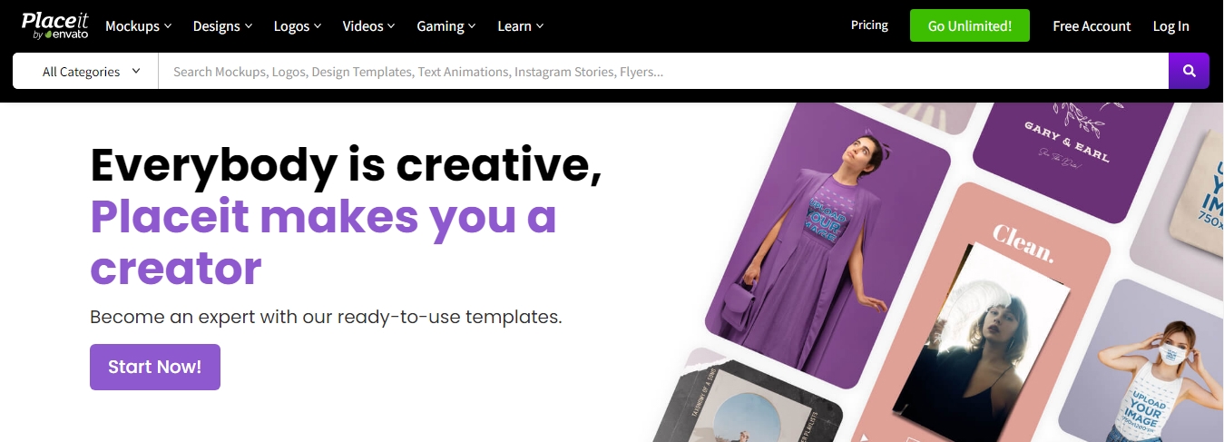 Placeit counts among the top Canva alternatives, particularly popular for offering a huge collection of templates, mockups, logos, and graphic design elements. You can access over 50,000+ free images, graphics, and templates on the platform and customize them with your text or logo easily.
