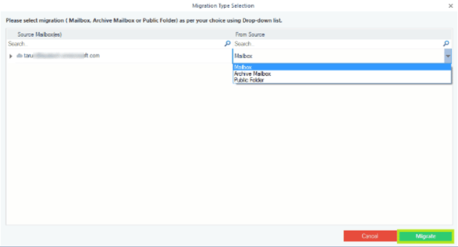 - Select “Migrate” after selecting “Mailbox,” “Archive Mailbox,” or “Public Folder” from the originating Office 365 account.