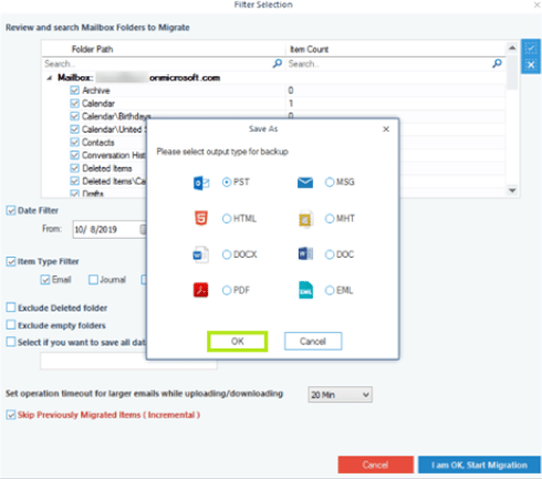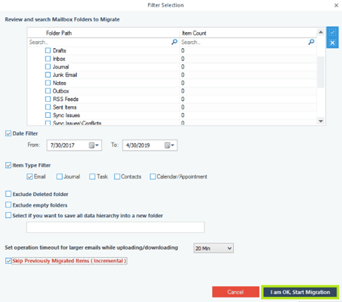 - Choose the required folders on the “Filter Selection” tab, use the date filter, item type filter, and other settings as necessary. To begin the movement, click “I am OK, Start Migration.”