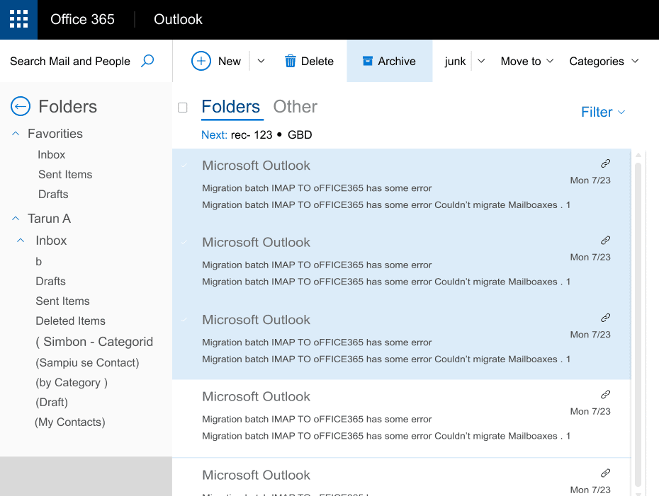 Note: You may also complete this step by choosing the emails to be archived, then clicking the “Archive” button on the Office 365 account’s top pane.