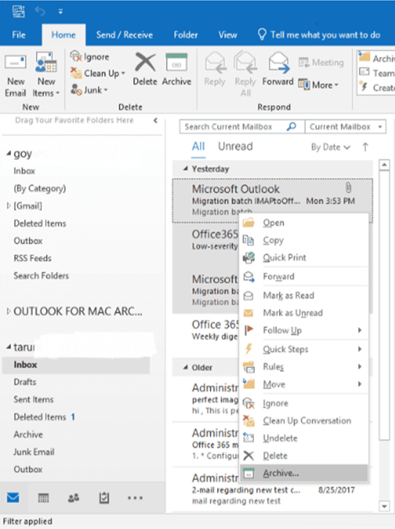 - It is necessary to Right-click on the chosen emails to bring up a wizard; select the “Archive” button to transfer the desired emails to the archive mailbox.