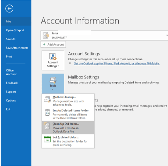 - Go to the “File” tab, choose “Tools,” and then select “Clean up old stuff” from the drop-down menu to transfer a whole folder to the archive.