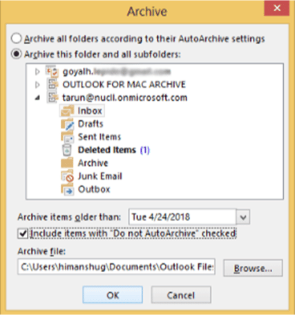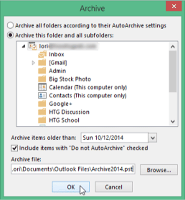 - A pane containing each of Outlook’s folders will display on the screen. Decide the exact folder you wish to archive. You may choose the date range from which to archive the emails in this section. Select the place on your system where you want to store this archive file and click “OK” to include emails that have “Do not Auto Archive” activated.