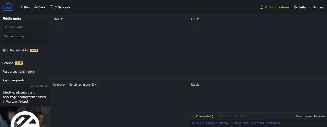 JS Fiddle is one of the oldest and most feature-rich code playgrounds. It has a lot of frameworks and libraries for developers who create complex websites.