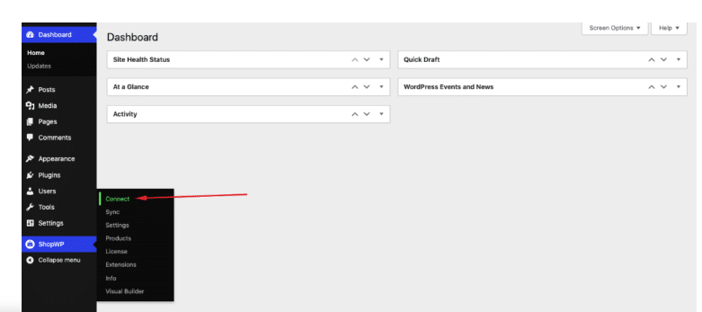 You’ll see the ShopWP option in the sidebar after installing the plugin. To begin establishing a connection between your Shopify store and WordPress site, hover over it and select Connect.
