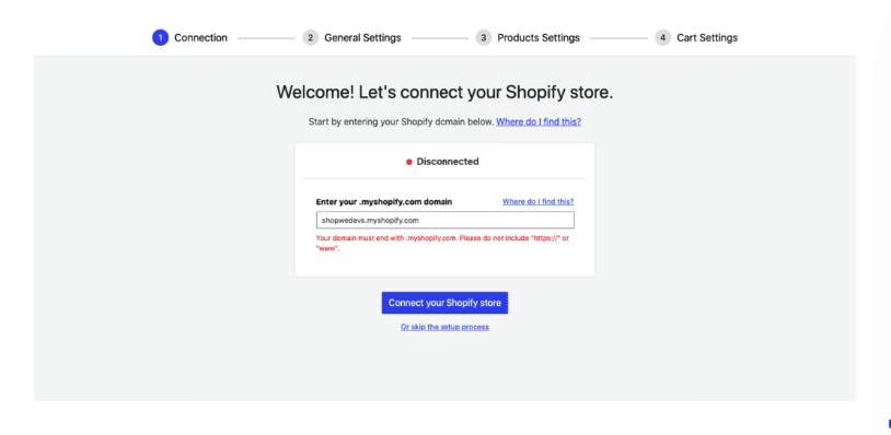 Click Begin the connection process on the next page to begin the connection procedure. Enter the Shopify store address you wish to connect to after that.