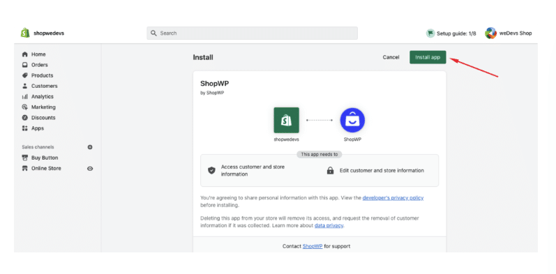 Give ShopWP access to your Shopify store on the following screen by selecting Install App. Once you’ve completed this step successfully, you’re done with it and add Shopify to WordPress integration. You will then be routed back to your WordPress site.