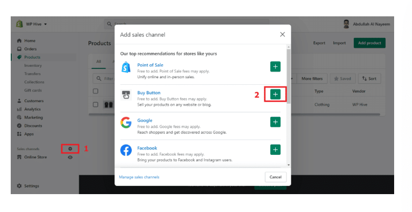 - Click the + button next to the Sales channels heading in your Shopify admin.