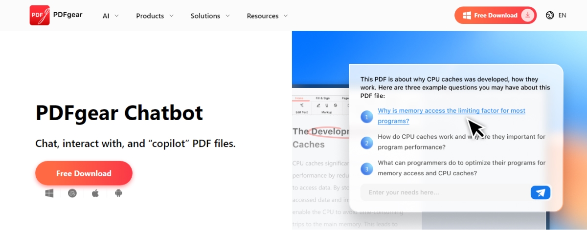 PDFgear Chatbot is a free and powerful PDF chatbot and an AI PDF editor. It lets you chat with PDF files for free, with no restrictions. It offers unlimited PDF chatting, unlike Humata, which only gives you 60 free pages.