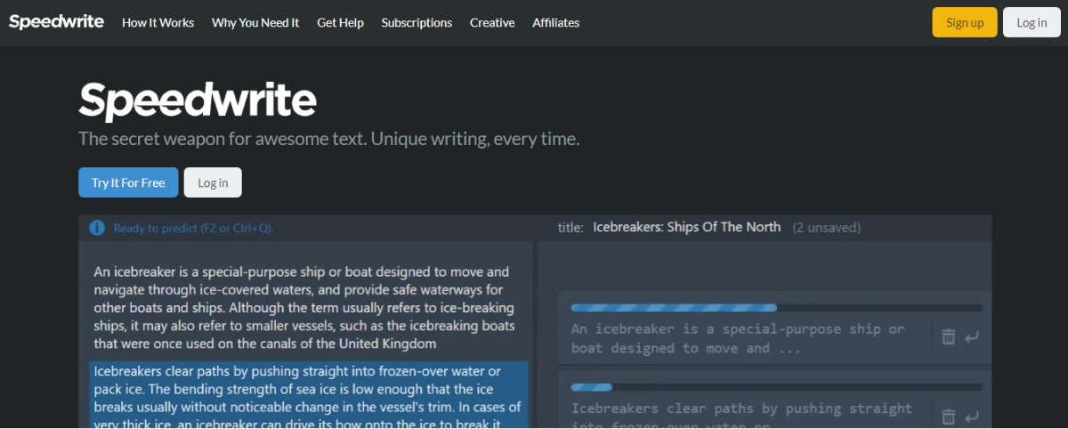 Speedwrite is an amazing article rewriter tool that can generate unique versions of any existing content. This is very useful for link-building and other marketing purposes. Speedwrite also lets you add line breaks to make your content more readable, which sets it apart from other AI content generators.