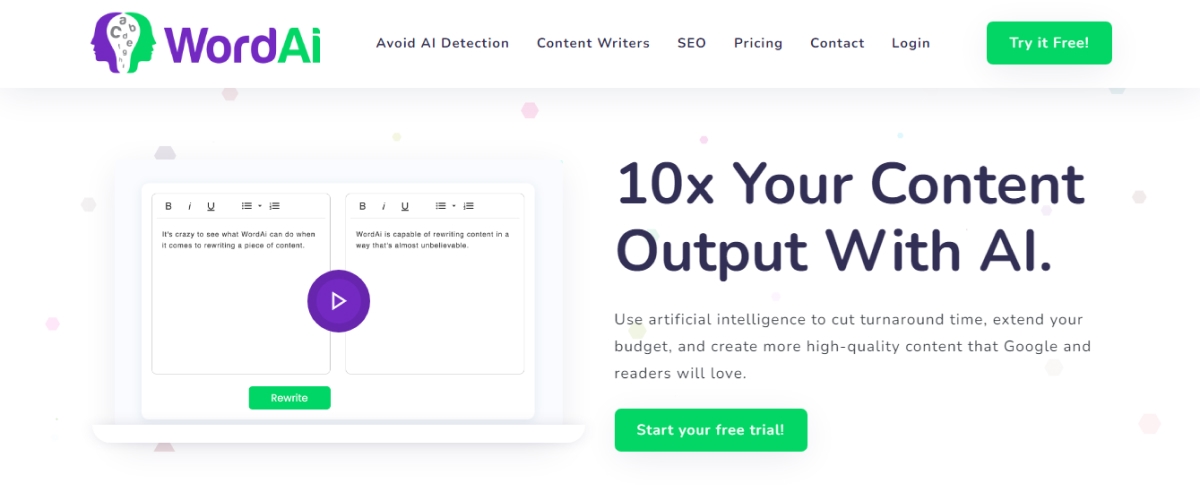WordAi is a smart and powerful tool that can automatically rewrite and paraphrase any text. It uses cutting-edge NLP methods to understand the meaning and context of the words and produce natural and accurate rewrites.