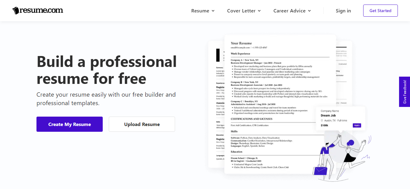 Resume.com is a free and proprietary online resume builder that helps you create and download your resume in minutes. It has a simple and straightforward interface that guides you through the resume creation process.