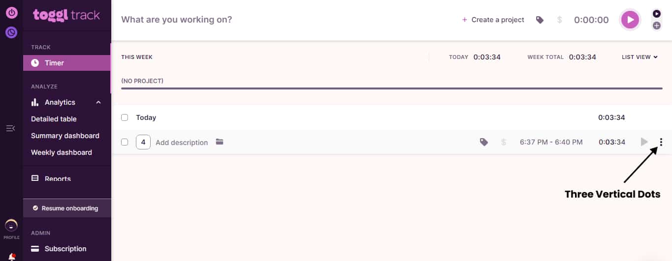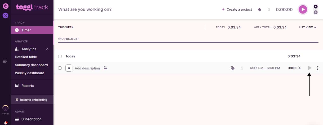 Our new project has been formed, as you can see in the upper-right section of your Toggl Track dashboard (see screenshot).